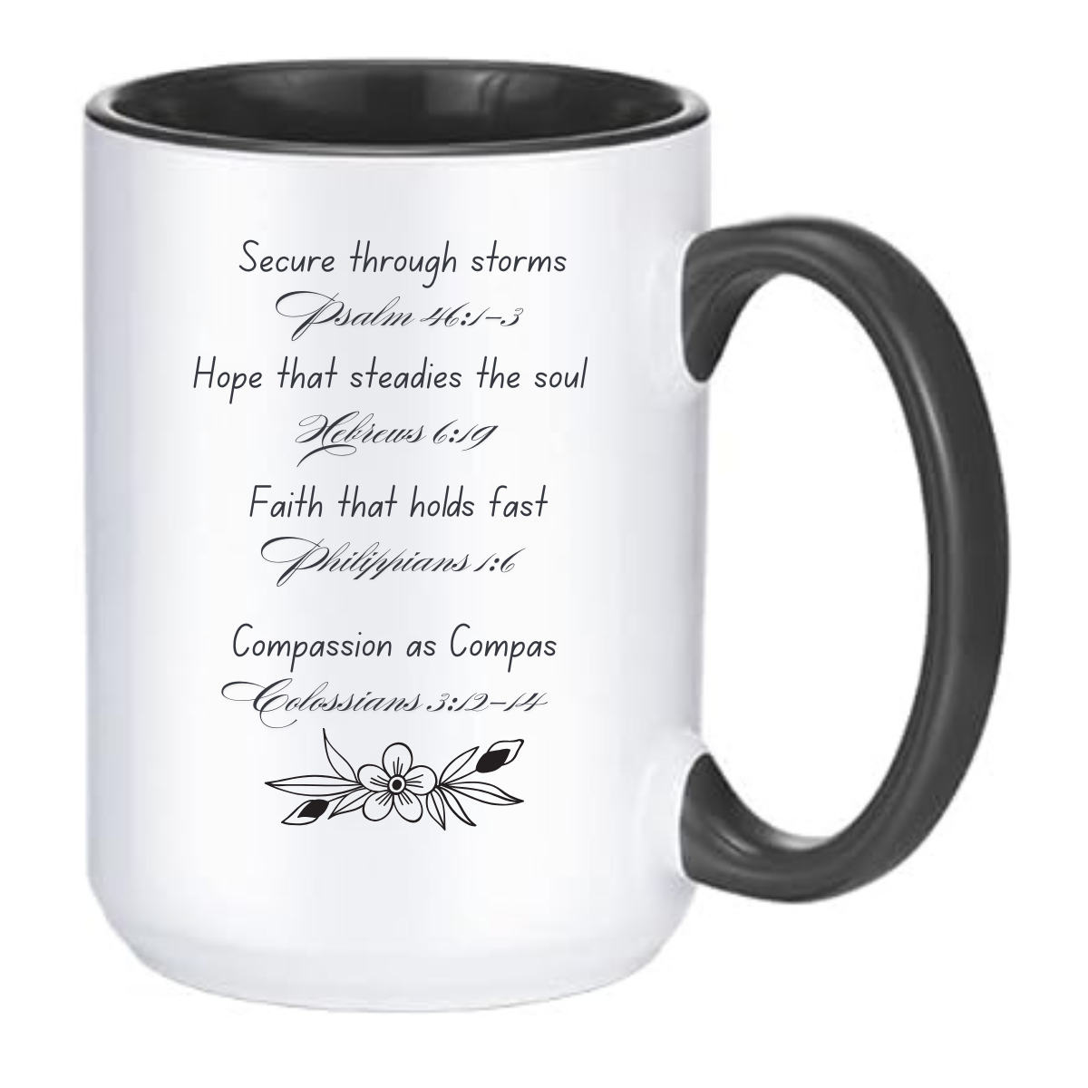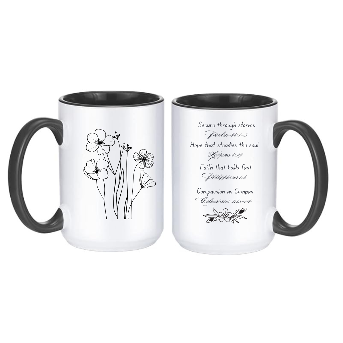 Featuring delicate black line florals on one side and a carefully curated selection of encouraging Bible verses on the other, this mug is a gentle reminder of strength, hope, faith, and compassion—perfect for quiet mornings or reflective evenings.