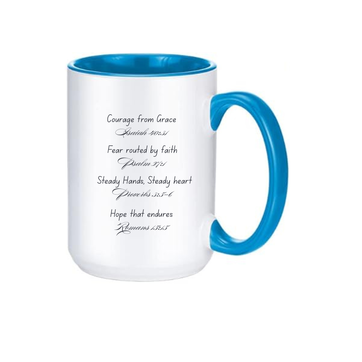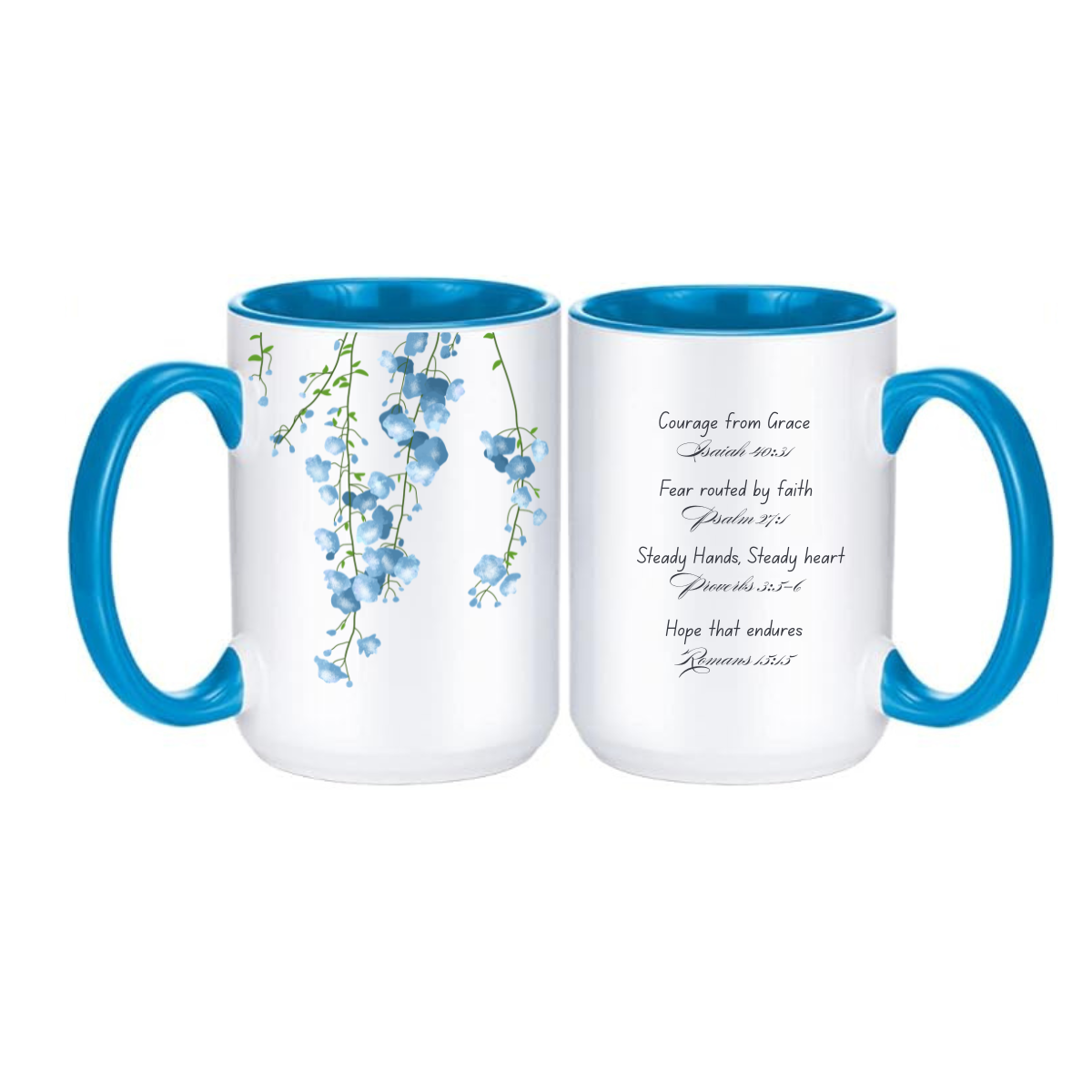 Adorned with soft cascading blue florals, this design reflects calm, reassurance, and quiet strength. Paired with a vibrant blue interior and handle, the mug offers a refreshing and uplifting presence—perfect for starting your day grounded in faith.