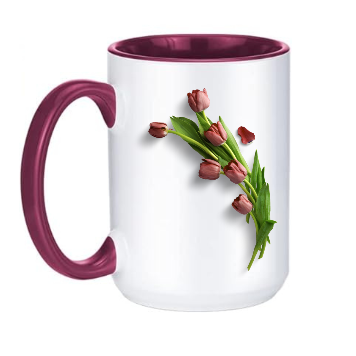 Featuring a graceful arrangement of soft, muted tulips, the design symbolizes renewal, peace, and quiet strength. Paired with a rich burgundy interior and handle, this mug blends elegance with meaning—perfect for moments of reflection over your favorite drink.