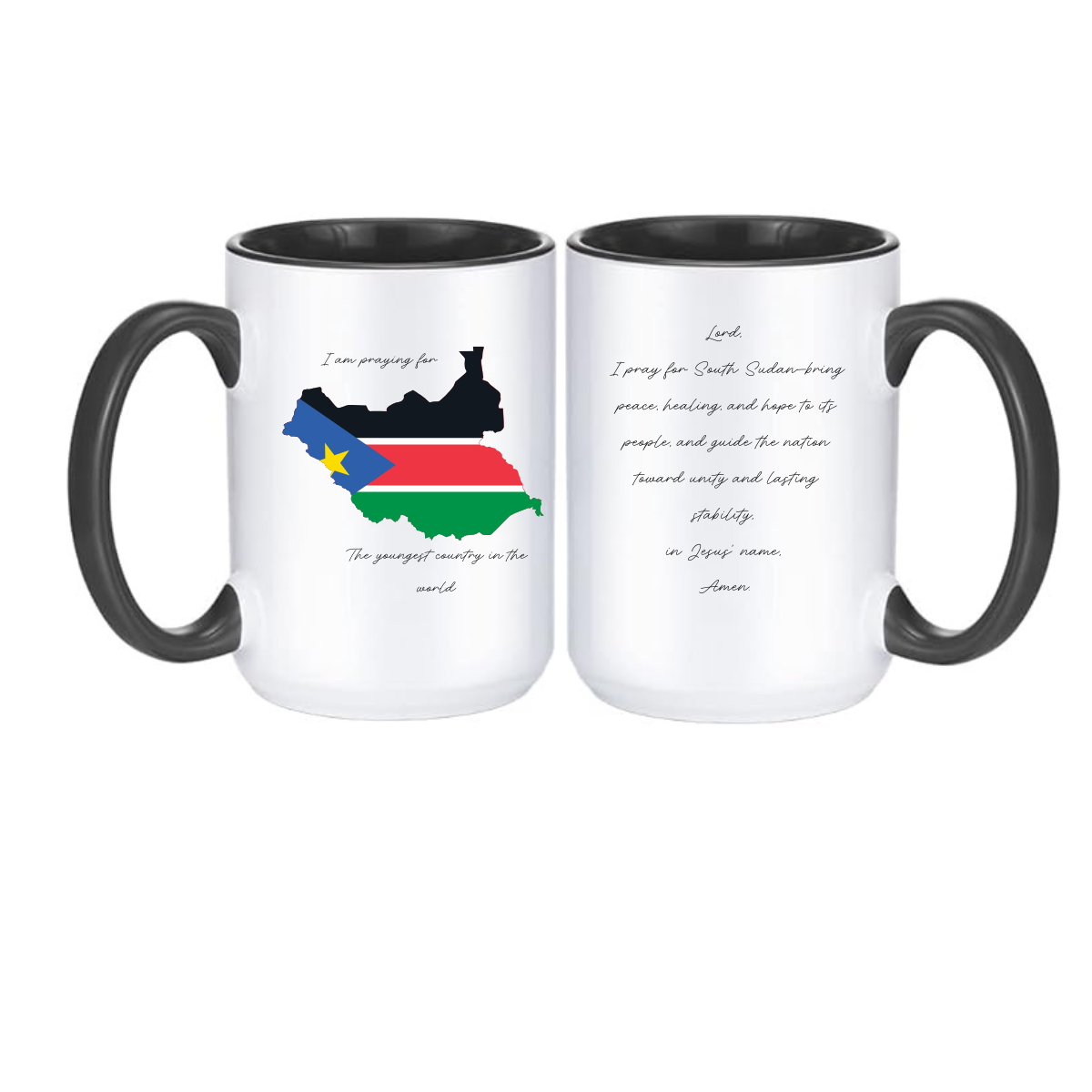 On one side, the words “I am praying for” highlight a bold and meaningful design of South Sudan, along with the reminder that it is “The youngest country in the world.” On the other side, a gentle, handwritten-style prayer calls for peace, healing, and stability—making every sip a moment of reflection and compassion.