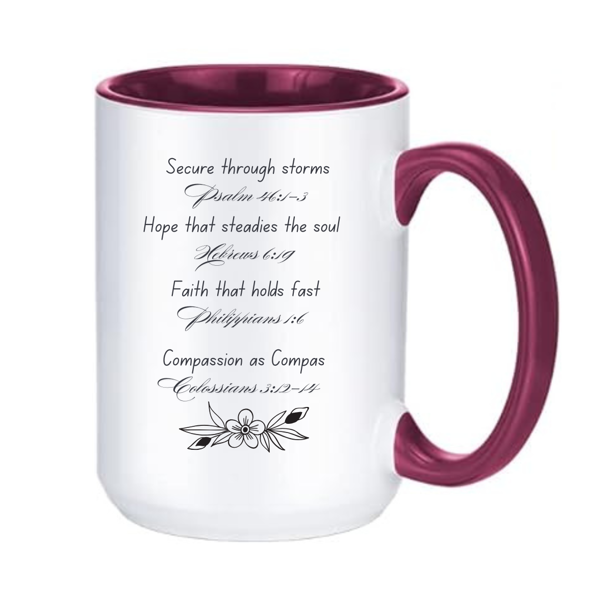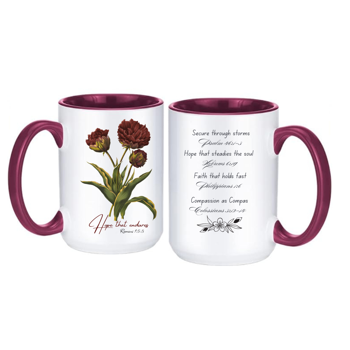 With its deep burgundy interior and handle, this mug adds a warm, elegant touch while delivering a message that grounds and uplifts. The detailed floral artwork symbolizes resilience and enduring beauty, perfectly complementing the message of steadfast faith.